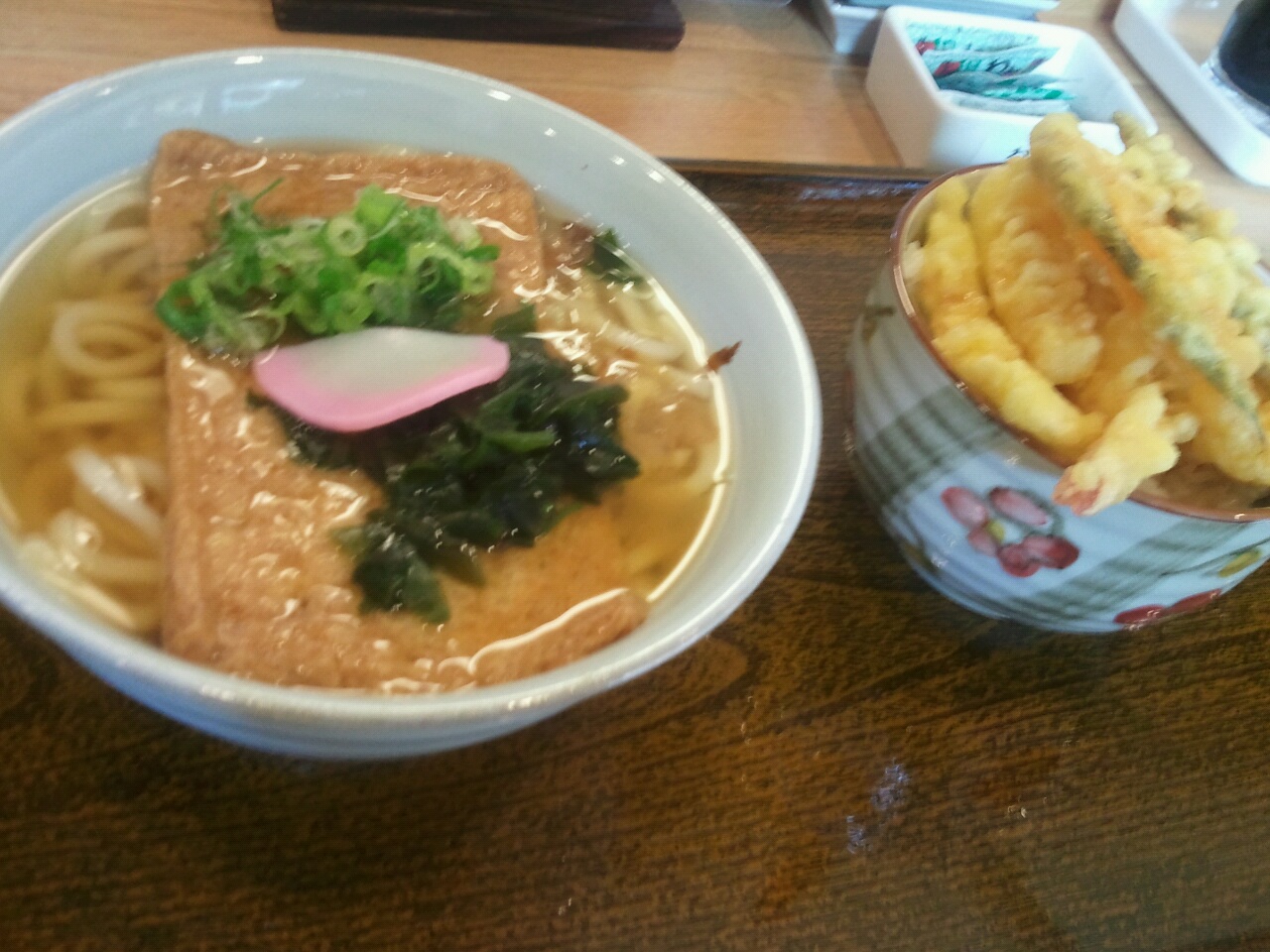 昼飯を近所のうどん屋でミニ天丼とうどんのセット