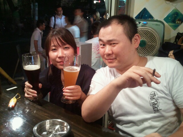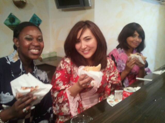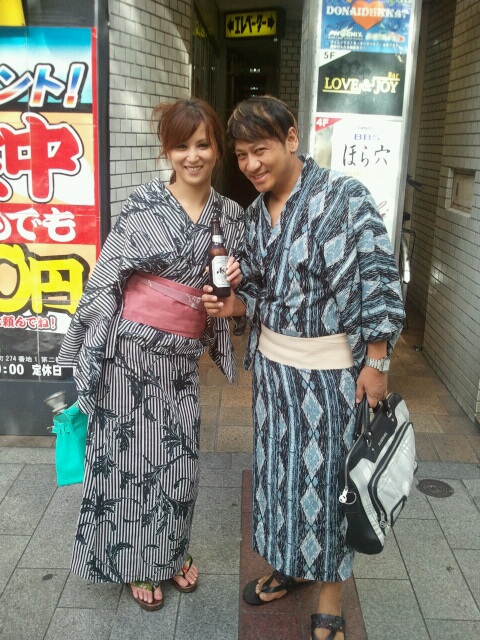 浴衣美人と浴衣ネパール人がハイチーズ、片手に瓶ビール