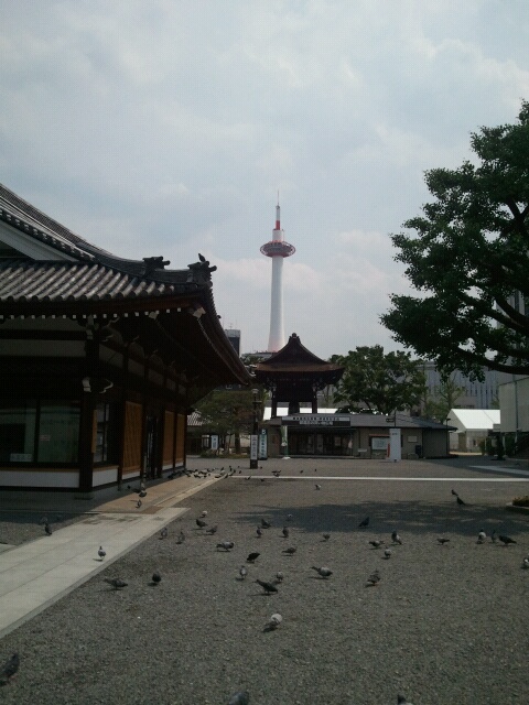 敷地内にはハト、その向こうに京都タワー