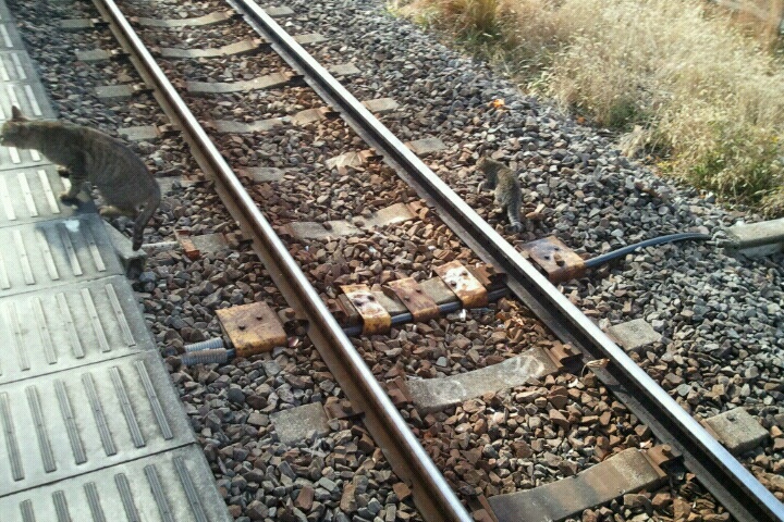 駅のホームでは猫の家族がお見送り