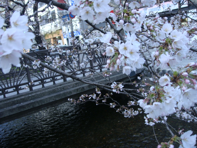 店の前を流れる高瀬川、桜が咲き始めて風情がある