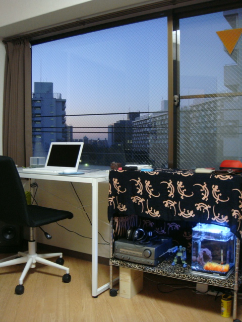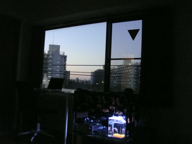 部屋の電気を消して、窓から見える朝焼けの景色がなかなか気に入ってる