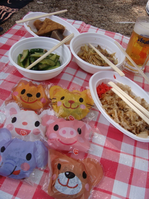 お母さんの湖の家で購入したおかずと手作りおにぎり(と、もちろんビールも!)