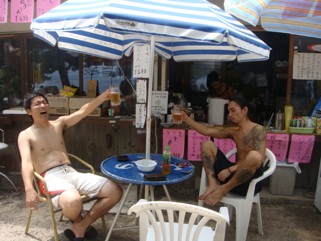 水着に着替えてさっそく海の家ならぬ、湖の家でカンパーイ!